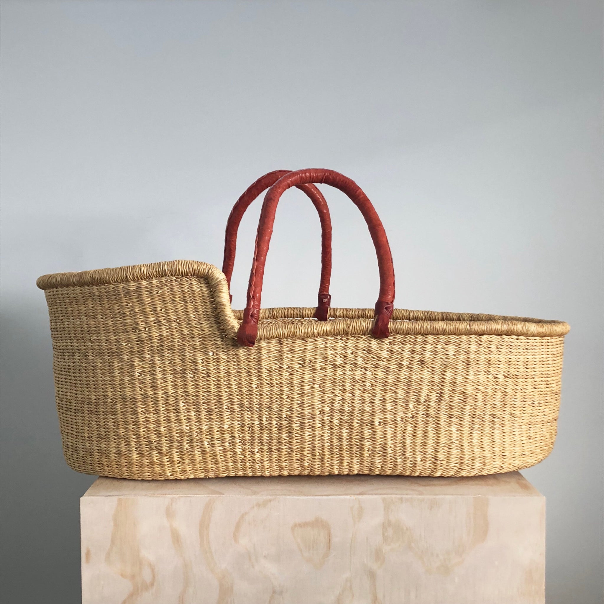 This Moses Basket comes in a classic natural coloured weave with tan leather handles and will look lovely in your baby's nursery. The baskets were handwoven in Bolga, northern Ghana using sundried elephant grass and coloured with traditional and non-toxic dyes. So you can rest assured it is chemical free for your precious newborn.